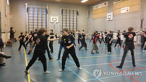 | △ 네덜란드 초등학교 한국알기 수업 개시식 (브뤼셀=연합뉴스) 24일(현지시간) 네덜란드 호스트안데마스 시의 초등학교에서 열린 '한국 알기 수업' 개시 행사에서 학생들이 태권도를 배우고 있다. 2015.2.25 << 주네덜란드 한국대사관 제공 >> photo@yna.co.kr |