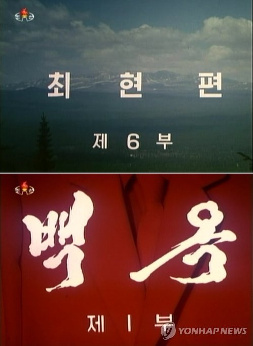 △ 북한 TV, 최룡해·오일정 부친 띄우기 (서울=연합뉴스) 북한 조선중앙TV는 최근 최룡해 노동당 비서의 부친 최현 전 인민무력부장과 오일정 당 부장의 부친 오진우 전 인민무력부장을 '충신'으로 그린 영화를 잇달아 방영했다. 사진은 최현을 묘사한 영화 '민족과 운명: 최현 편' 6부(지난달 30일 방영, 위쪽)와 오진우에 관한 영화 '백옥' 1부(이달 24일 방영, 아래쪽)의 시작 화면을 캡처한 것. 2014.11.25 nkphoto@yna.co.kr