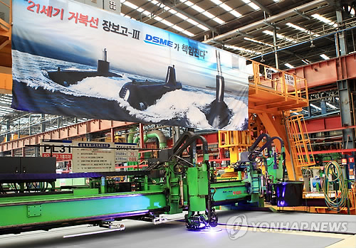 △ 3천t급 중형 잠수함 장보고Ⅲ 건조 시작 (거제=연합뉴스) 김재홍 기자 = 27일 경남 거제시 대우조선해양 옥포조선소에서 3천t급 중형 장수함 장보고Ⅲ 건조 시작을 알리는 강재 절단 작업이 진행 중이다. 장보고Ⅲ는 2018년 진수하고 2년 전력화 과정을 거쳐 2020년 실전에 배치될 예정이다. 2014.11.27 pitbull@yna.co.kr