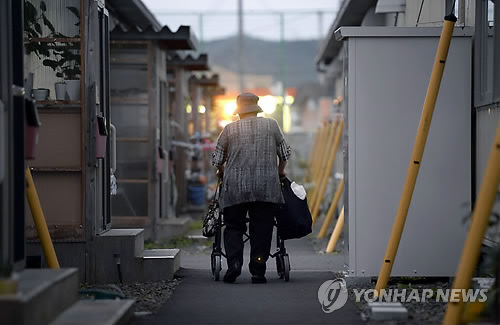 △ (교도=연합뉴스)2014년 9월 일본 미야기 현의 한 가설주택 단지에서 걸어가는 노인의 모습.