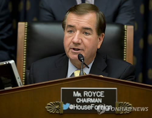 | △ 미국 하원 외교위원회가 27일(현지시간) 전체회의에서 새로 상정된 대북제재 강화 법안(H.R. 757)을 만장일치로 하원 본회의에 상정하기로 결정했다. 이 법안을 발의한 에드 로이스(공화·캘리포니아) 미 하원 외교위원장 (AP=연합뉴스 자료사진) |