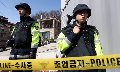 | △ 화성 총기난사 현장 (화성=연합뉴스) 신준희 기자 = 27일 엽총 난사로 4명이 숨진 경기도 화성 사건 현장에서 경찰들이 경계 근무를 서고 있다. |