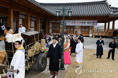안동시 정상동에서 열린 이날 재현행사는 추산 선생 추념 시 낭독, 신흥무관학교 교가 제창에 이어 선생이 식솔들과 함께 가재도구를 2대의 소달구지에 나눠 싣고 만주로 향하던 상황극 등의 순으로 진행됐다.
