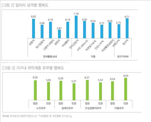 상용직(6.62점)의 행복도는 고용주·자영업자, 비경제활동인구(이상 6.19점), 임시일용직(5.68점), 실업자(4.87점)보다 높았다.