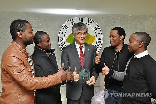 (경산=연합뉴스) 이강일 기자 = 홍덕률 대구대 총장이 아프리카 유학생들의 유학생활에 도움을 준 것을 계기로 제자들에게 감사패를 받았다.