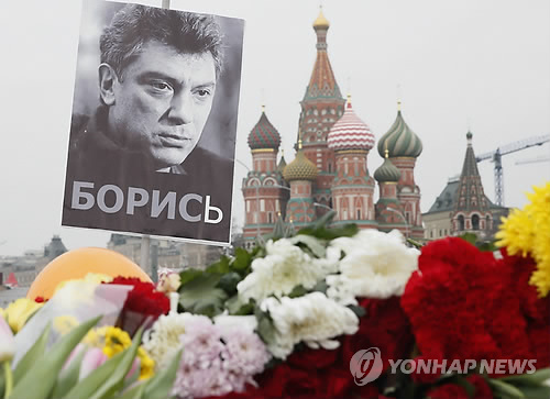 △ (EPA=연합뉴스) 2일(현지시간) 러시아 야권지도자 보리스 넴초프(55)의 초상 아래로 그를 추모하는 꽃들이 그가 지난달 27일 피살된 모스크바 중심부에 놓여있다.