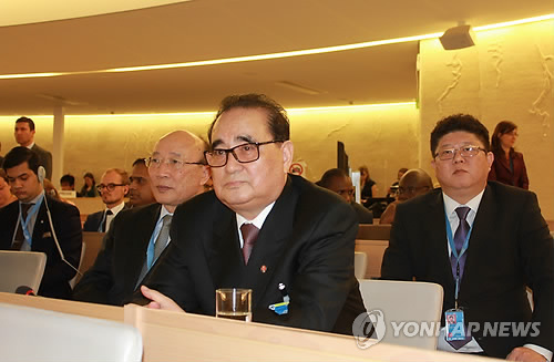 △ 남북, 유엔 인권이사회서 北 인권 놓고 격돌 (제네바=연합뉴스) 류현성 특파원 = 남북이 3일(현지시간) 스위스 제네바 유럽 유엔본부에서 열린 제28차 유엔 인권이사회에서 북한 인권문제를 둘러싸고 격돌했다. 사진은 북한 리수용 외무상이 유엔 인권이사회에서 기조연설을 앞두고 자리에 앉아 있는 모습. 2015.3.4 rhew@yna.co.kr