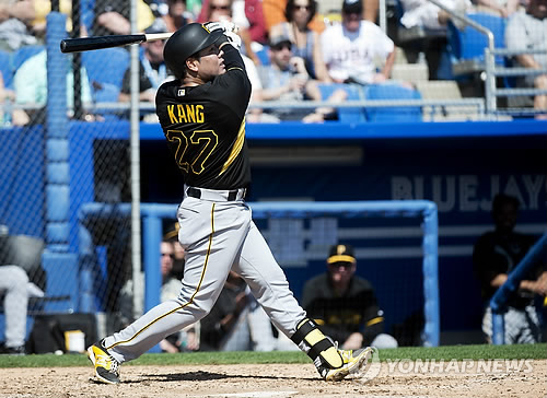 | △ 강정호, 실전 데뷔전서 솔로 홈런 (AP/더 캐내디언 프레스=연합뉴스) 3일(현지시간) 미국 플로리다주 더네딘에서 메이저리그 토론토 블루제이스와의 첫 시범경기 3회에 강정호(28·피츠버그 파이리츠)가 솔로 홈런포를 터뜨리고 있다. 강정호에게 홈런을 맞은 투수는 지난해 밀워키 브루어스에서 7승 6패, 평균자책점 4.36을 남기는 등 메이저리그 통산 23승 26패, 평균자책점 4.23을 기록한 우완 마르코 에스트라다. bulls@yna.co.kr |