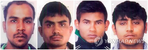 | △ 2012년 12월 인도 뉴델리의 버스 안에서 여대생을 성폭행한 혐의로 사형선고를 받은 4명. 맨 왼쪽이 무케시 싱(29)으로, 그는 최근 '인도의 딸'이라는 다큐멘타리 영화에서 "품위 있는 여성은 밤 9시에 밖으로 나다니지 않는다", "성폭행당할 때 저항해선 안 되고 조용히 성폭행을 허락해야 한다"는 등 피해자를 비난하고 자신의 범죄를 정당화하는 내용의 인터뷰를 했다.(AP=연합뉴스DB) |