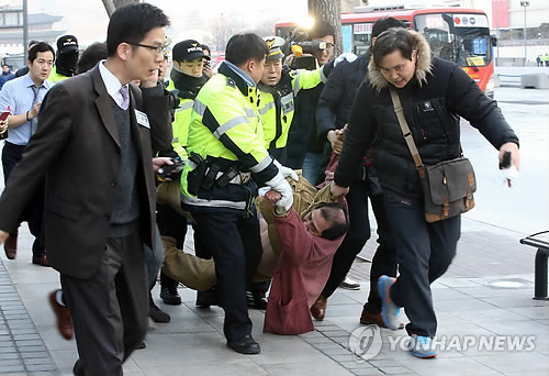| △ 체포된 리퍼트 미 대사 습격 괴한 (서울=연합뉴스) 김주성 기자 = 5일 오전 서울 세종문화회관에서 열린 민화협 주최 초청 강연에서 마크 리퍼트 주한 미국대사를 습격한 용의자가 경찰에 체포돼 끌려가고 있다. |