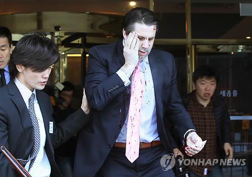 △ 민화협 행사장서 괴한 공격당한 리퍼트 주한 미 대사 (서울=연합뉴스) 김주성 기자 = 마크 리퍼트 주한 미대사가 5일 오전 서울 세종문화회관에서 열린 민화협 주최 초청 강연에 참석했다가 괴한의 공격을 받고 피를 흘리며 행사장을 빠져나가고 있다. 2015.3.5 utzza@yna.co.kr