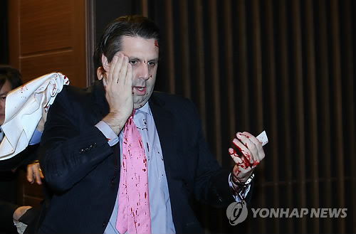| △ 민화협 행사장서 괴한 공격당한 리퍼트 주한 미 대사 (서울=연합뉴스) 김주성 기자 = 마크 리퍼트 주한 미대사가 5일 오전 서울 세종문화회관에서 열린 민화협 주최 초청 강연에 참석했다가 괴한의 공격을 받고 피를 흘리며 행사장을 빠져나가고 있다. |