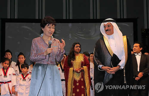 박 대통령은 또 "앞으로 양국 간 태권도를 비롯해 문화, 체육 등 다양한 분야에서 교류가 더욱 확대됐으면 한다"며 "특히 2022년에는 카타르에서 월드컵 축구대회가 열리게 되는데 2002년에 월드컵을 개최한 한국의 경험을 같이 공유해 더 멋진 월드컵이 되도록 함께 노력해 나갔으면 한다"고 당부했다.