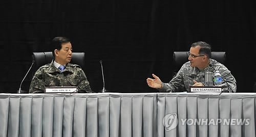 △ 한민구 국방장관(왼쪽)이 6일 성남공군기지 미군시설 내의 키리졸브 훈련개념발전 예행연습 현장을 찾아 커티스 스캐퍼로티 한미연합사령관과 대화를 나누고 있다.