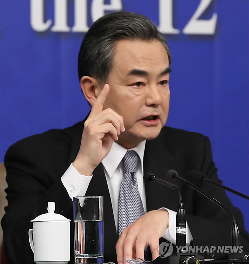△ 왕이 중국 외교부장 내외신 기자회견 (베이징=연합뉴스) 이준삼 특파원 = 왕이(王毅) 중국 외교부장이 전국인민대표대회(전인대) 기간인 8일 베이징(北京) 미디어센터에서 내외신 기자회견을 열고 중국의 대외정책을 설명하고 있다. 2015.3.8 jslee@yna.co.kr