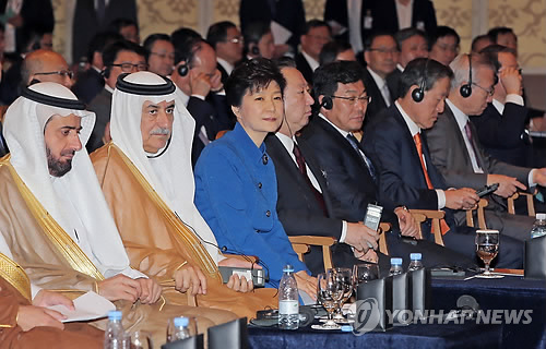 △ 한·사우디 비즈니스 포럼 참석한 박 대통령 (리야드=연합뉴스) 이정훈 기자 = 박근혜 대통령이 4일 오전(현지시간) 사우디아라비아 리야드 포시즌스호텔에서 열린 한국·사우디아라비아 비즈니스 포럼에 참석해 사회자의 발언을 듣고 있다.