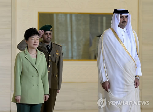 | △ 박 대통령, 카타르 공식환영식 참석 (도하=연합뉴스) 도광환 기자 = 박근혜 대통령이 8일 오전(현지시간) 카타르 도하 에미리 디완 궁에서 열린 공식환영식에서 타밈 빈 하마드 알타니 국왕과 양국 국가연주를 듣고 있다. |