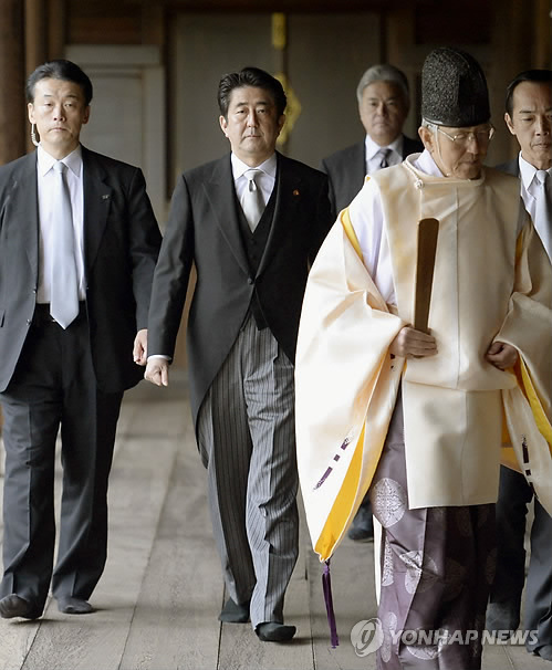 | △ 2013년 12월 26일 야스쿠니 신사를 방문한 아베 신조 일본 총리. 아베 총리는 취임 1주년을 맞이한 이날 야스쿠니 신사를 참배해 국제사회의 비판을 받았다. (교도=연합뉴스 DB) |