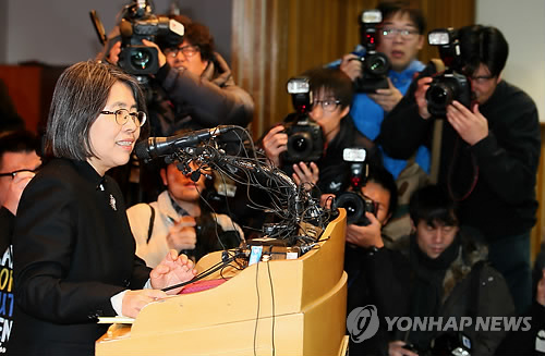 △ 김영란 기자회견 (서울=연합뉴스) 박지호 기자 = 김영란 전 국민권익위원장이 국회가 처리한 김영란법이 졸속입법 및 위헌논란을 빚는 것과 관련해 10일 오전 서울 신수동 서강대학교 다산관에서 기자회견을 하고 있다.