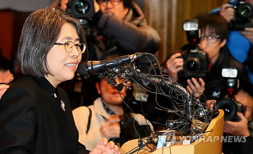 △ 김영란 전 국민권익위원장 기자회견 (서울=연합뉴스) 박지호 기자 = 김영란 전 국민권익위원장이 국회가 처리한 김영란법이 졸속입법 및 위헌논란을 빚는 것과 관련해 10일 오전 서울 신수동 서강대학교 다산관에서 기자회견을 하고 있다.