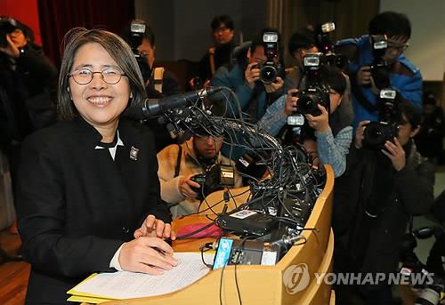 | △ 입장 밝히는 김영란 전 국민권익위원장 (서울=연합뉴스) 박지호 기자 = 김영란 전 국민권익위원장이 국회가 처리한 김영란법이 졸속입법 및 위헌논란을 빚는 것과 관련해 10일 오전 서울 신수동 서강대학교 다산관에서 기자회견을 하고 있다. |