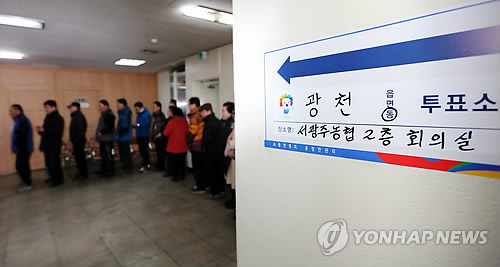 | △ 조합장선거 '북적' (광주=연합뉴스) 박철홍 기자 = 제1회 전국동시조합장선거 투표일인 11일 오전 광주 서구 광천동 서광주농협 2층 광천동투표소에서 조합원들이 투표를 위해 줄지어 기다리고 있다. |