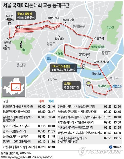 풀 코스 구간 중 광화문삼거리∼세종대로사거리는 오전 5시∼8시, 을지로·청계천로·종로 등 도심권 구간은 오전 7시50분∼11시, 신설동역오거리·군자교·화양사거리·잠실대교·배명사거리 구간은 오전 11시∼오후 1시35분에 각각 교통이 통제된다.