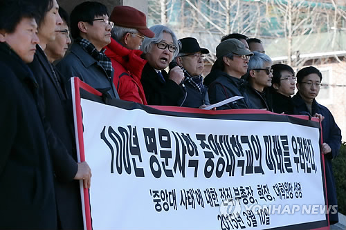 | △ '중앙대학교의 미래를 우려한다' (서울=연합뉴스) 박동주 기자 = 중앙대학교 전직 부총장, 대학원장, 단과대학장 등이 10일 서울 동작구 중앙대학교에서 2016학년도 학과제 전면 폐지를 골자로 한 중앙대 학사구조 개편안에 대한 입장을 담은 성명을 발표하고 있다. 2015.3.10 pdj6635@yna.co.kr |