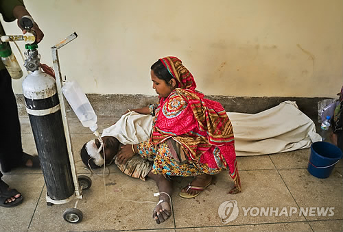 △ 12일(현지시간) 방글라데시 쿨르나 병원에서 시멘트공장붕괴사고로 다친 노동자를 아내도 돌보고 있다.(AP=연합뉴스)