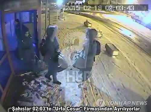 △ 지난 1일(현지시간) 이슬람 극단주의 무장세력 '이슬람국가'(IS)에 합류한 영국 10대 소녀 3명이 시리아 입국 전 터키 이스탄불에서 버스를 기다리는 모습이 담긴 폐쇄회로TV(CCTV) 화면이 공개됐다. (AP=연합뉴스)