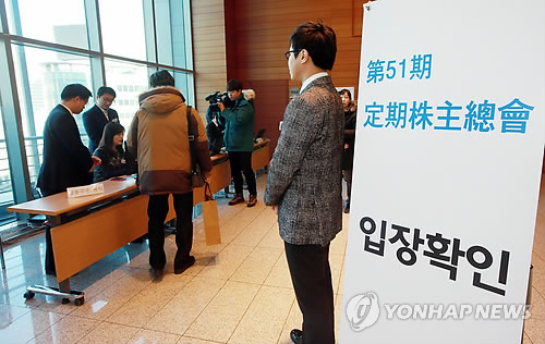 △ 제일모직 정기 주주총회 (서울=연합뉴스) 박동주 기자 = 13일 오전 서울 명동 중앙우체국에서 열린 제일모직 정기 주주총회에서 주주 등이 입장하고 있다.