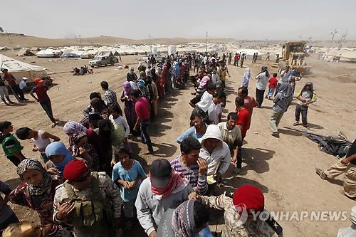 △ 시리아 난민들이 이라크 국경지대 이르빌 난민촌에 도착해 식량배급을 받기 위해 줄지어 있는 모습. (AP=연합뉴스 자료사진)