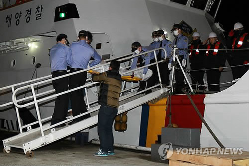 (목포=연합뉴스) 장아름 기자 = 지난 13일 전남 신안 가거도 해상에서 추락한 해경 헬기 실종자 중 처음으로 발견된 정비사의 시신이 목포로 이송됐다.