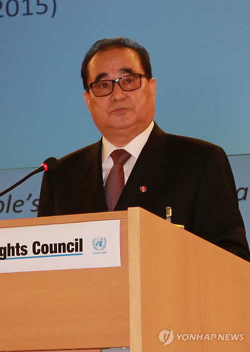 △ 기조연설하는 북한 리수용 외무상 (제네바=연합뉴스) 류현성 특파원 = 남북이 3일(현지시간) 스위스 제네바 유럽 유엔본부에서 열린 제28차 유엔 인권이사회에서 북한 인권문제를 둘러싸고 격돌했다. 사진은 북한 리수용 외무상이 유엔 인권이사회에서 기조연설하는 모습. 2015.3.4 rhew@yna.co.kr