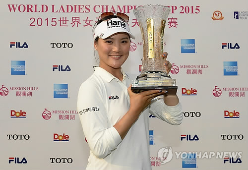 | △ 유소연, 월드 레이디스 챔피언십 최종우승 (서울=연합뉴스) 유소연이 15일 중국 하이난성 하이커우 미션힐스골프장 블랙스톤코스에서 열린 LET 월드 레이디스 챔피언십에서 최종합계 13언더파 279타로 우승을 차지한 후 우승 트로피를 들고 기념촬영을 하고 있다. 2015.3.15 << 미션힐스 제공 >> photo@yna.co.kr |