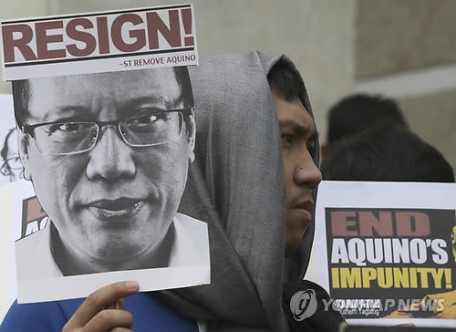 | △ 2015년 2월 25일 필리핀 시민혁명 29주년 행사에서 아키노 대통령 퇴진을 요구하는 시민. (AP=연합뉴스 자료사진) |