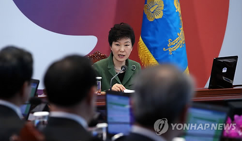 | △ 국무회의서 발언하는 박 대통령 (서울=연합뉴스) 도광환 기자 = 박근혜 대통령이 17일 오전 청와대 위민관 영상국무회의실에서 열린 국무회의에서 발언하고 있다. |