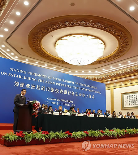 △ 지난 2014년 10월 베이징에서 열린 아시아인프라투자은행(AIIB) 설립 양해각서(MOU) 체결식.(AP=연합뉴스)