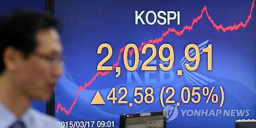 | △ 코스피 2% 상승 (서울=연합뉴스) 박지호 기자 = 코스피는 17일 대형주의 강세로 42.58포인트(2.14%) 오른 2,029.91로 장을 마쳤다. 사진은 이날 오후 서울 중구 을지로 외환은행 본점 딜링룸의 모습. 2015.3.17 jihopark@yna.co.kr |