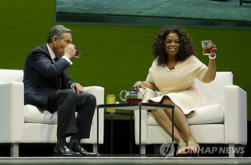 △ (AP=연합뉴스) 하워드 슐츠 스타벅스 최고경영자(CEO)가 2014년 3월 19일(현지시간) 미국 시애틀에서 열린 스타벅스 연례주주총회에서 방송계 거물 오프라 윈프리와 함께 신제품 '오프라 차이'를 소개하고 있다. 스타벅스는 새로운 주력 사업으로 선택한 차(tea) 시장의 활로 개척을 위해 윈프리와 손잡고 그녀의 취향대로 제조된 오프라 차이를 판매할 예정이다.
