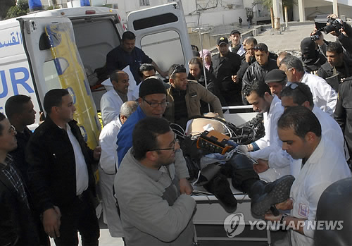 △ (AP=연합뉴스) 18일(현지시간) 튀니지 수도 튀니스의 박물관 총격 테러 사건으로 부상을 입은 경찰관 1명이 들것에 실려 병원으로 옮겨지고 있다.