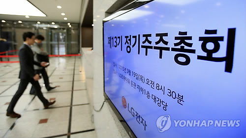 △ LG전자 정기 주주총회 개최 (서울=연합뉴스) 홍해인 기자 = 19일 오전 서울 여의도 LG트윈타워에서 열린 제13기 정기주주총회 참석자들이 총회장으로 들어가고 있다.