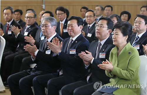 △ (부산=연합뉴스) 도광환 기자 = 박근혜 대통령이 16일 오전 부산 벡스코에서 열린 부산창조경제혁신센터 출범식에 참석, 조홍근 센터장, 신동빈 롯데그룹 회장, 임종룡 금융위원장 등과 함께 박수치고 있다. 2015.3.16 dohh@yna.co.kr