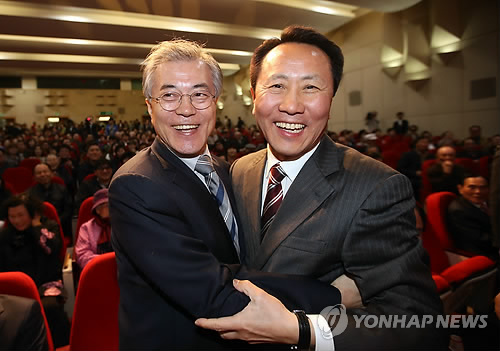 | △ 조영택 후보와 포옹하는 문재인 대표 (광주=연합뉴스) 박철홍 기자 = 새정치민주연합 문재인 대표가 22일 오후 광주 동구 KT빌딩에서 열린 아시아문화전당특별법 통과 보고대회에 참석해 광주 서구을 국회의원 보궐선거 새정치민주연합 조영택 후보를 만나 포옹하고 있다. 2015.3.22 pch80@yna.co.kr |
