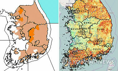 △ 붉게 물든 '산불위험지수 지도' (대전=연합뉴스) 정윤덕 기자 = 전국 대부분 지역에 건조특보(왼쪽)가 내려진 가운데 산림청이 운영하는 국가산불위험예보시스템상 산불위험지수 지도(오른쪽)도 23일 오후 4시 30분 현재 온통 붉게 물들어 있다. 2015. 3. 23. cobra@yna.co.kr