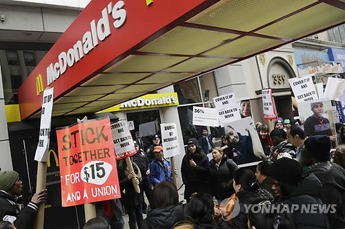 △ 맥도날드 매장 앞에서 '시급 15달러 쟁취 투쟁'을 벌이는 패스트푸드 종업원들 (AP=연합뉴스)