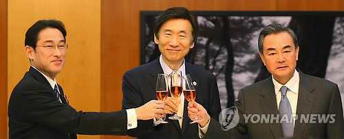 △ 윤병세 외교부 장관(가운데)이 2015년 3월 21일 오후 서울 용산구 한남동 외교장관 공관에서 열린 한중일 외교장관 만찬에서 왕이 중국 외교부장(오른쪽), 기시다 후미오 일본 외무상과 함께 건배를 하고 있다.