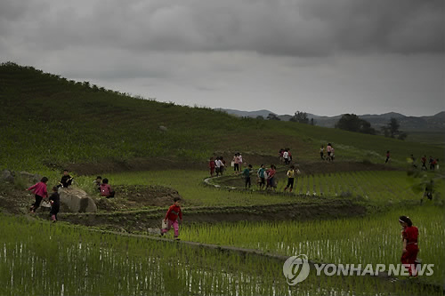 △ 북한 평양 교외 농촌 풍경 (AP=연합뉴스) 2014.6.21 In this Saturday, June 21, 2014 photo, North Korean schoolchildren work together in a rice paddy southeast of Pyongyang, North Korea. For more than four decades, farming in the North was characterized by heavy use of mechanization swiftly followed by chronic fuel and equipment shortages and stopgap policies. (AP Photo/David Guttenfelder)