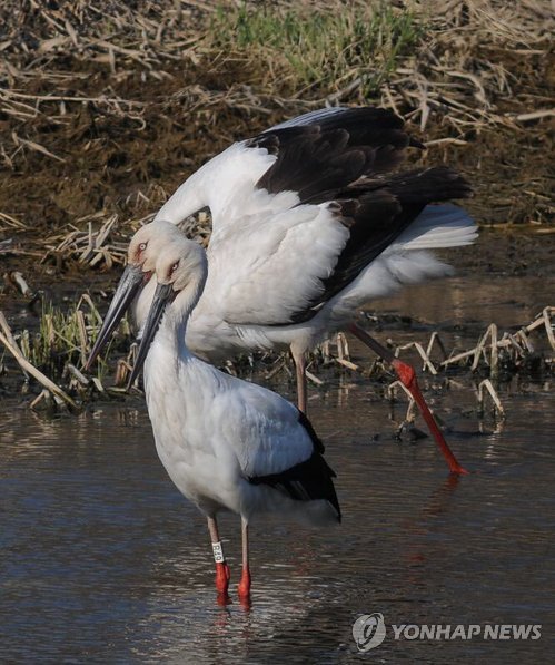 △ 황새 '미호' 이번엔 진천서 발견 (청주=연합뉴스) 황정현 기자 = 박시룡 한국교원대 황새 생태연구원장은 25일 1년 전 청람 황새공원을 탈출했던 황새 미호가 지난 24일 진천 미호천에서 거니는 모습이 발견됐다고 밝혔다. 최근 청주 옥산 미호천과 충남 천수만 등에서 발견된 뒤 진천에서 발견되면서 '둥지' 주변을 맴도는 황새의 귀소본능이 다시 확인된 셈이다. 'B49'번 인식표를 단 황새 미호는 지난해 4월 사육사가 다리에 인식표를 교체하는 틈을 타 청람 황새공원을 탈출했다. 2015.3.25 <<박시룡 한국교원대 황새 생태연구원장 제공>> sweet@yna.co.kr