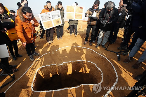 | △ 충주서 기원전 2∼1세기 목관묘 발견 (충주=연합뉴스) 전창해 기자 = 충북 충주시 호암동 일원의 종합스포츠타운 건설 현장에서 신라와 백제, 가야가 본격 태동하기 직전인 기원전 2∼1세기 목관묘가 발견됐다. 사진은 지난 1월 19일 열린 발굴조사 현장설명회에서 조순흠 중원문화재연구원 조사연구실장이 취재진에 유물이 출토된 무덤에 대해 설명하는 모습. jeonch@yna.co.kr |